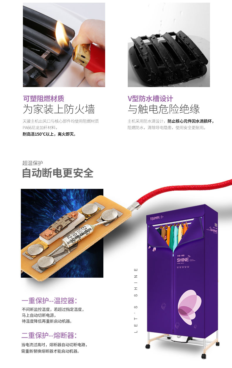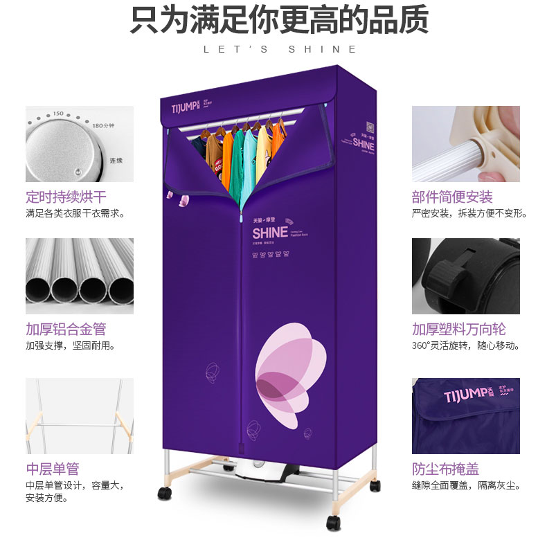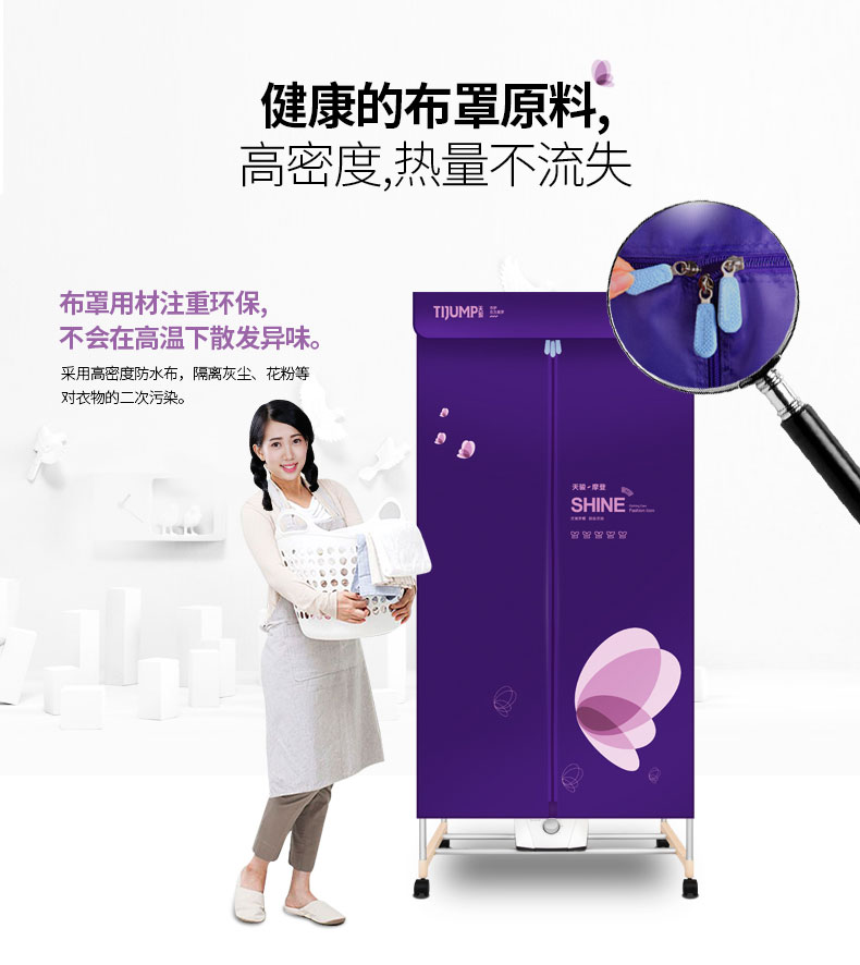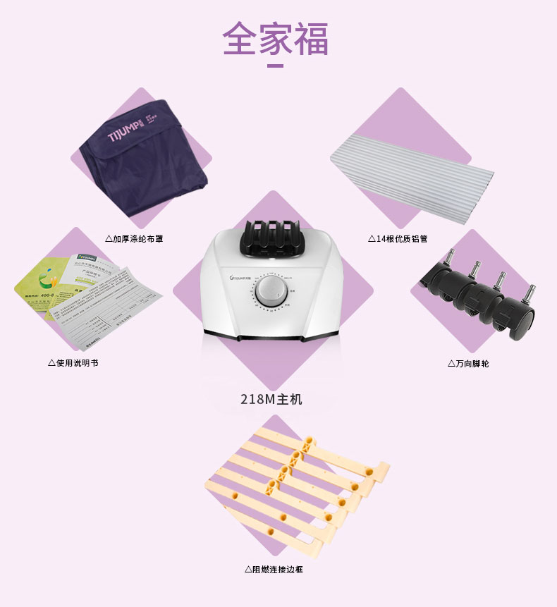 型号: TJ-218M 颜色分类: 紫色 功率: 501W(含)-1000W(含) 形状: 立方形 承载重量: 10kg-15kg 最大定时范围: 121分钟(含)-240分钟(含) 有无脚轮: 有 是否有断电保护功能: 有 加热方式: PTC 适用场景: 家用 支架材质: 铝合金 控制方式: 机械式
