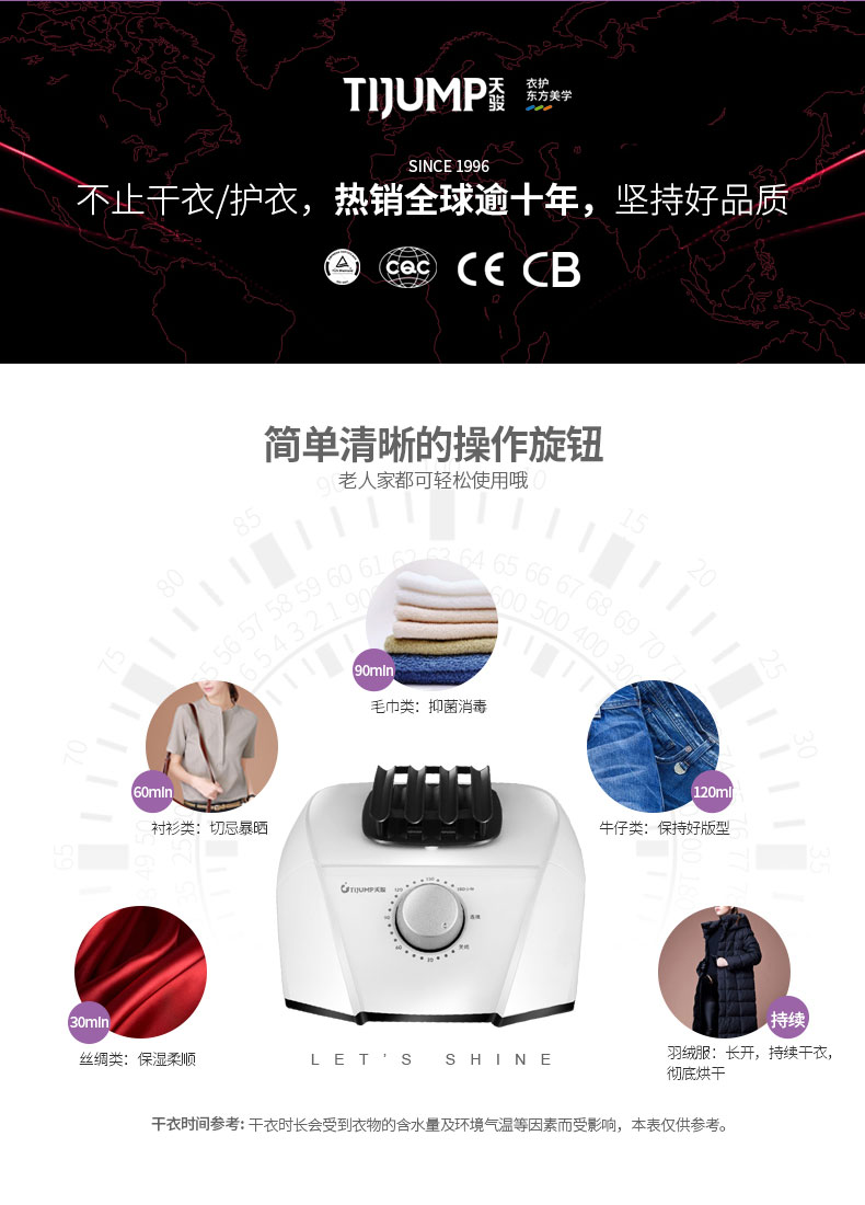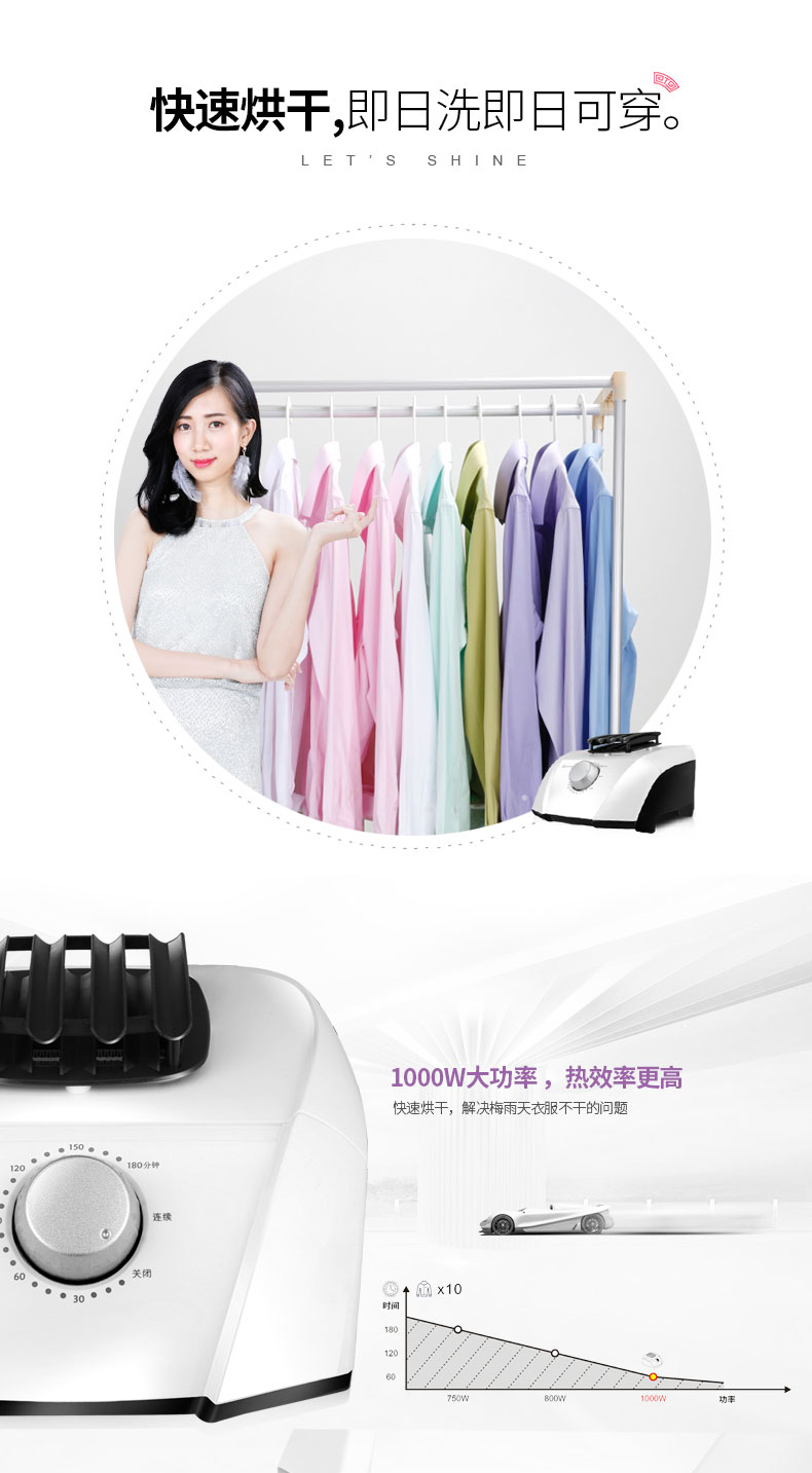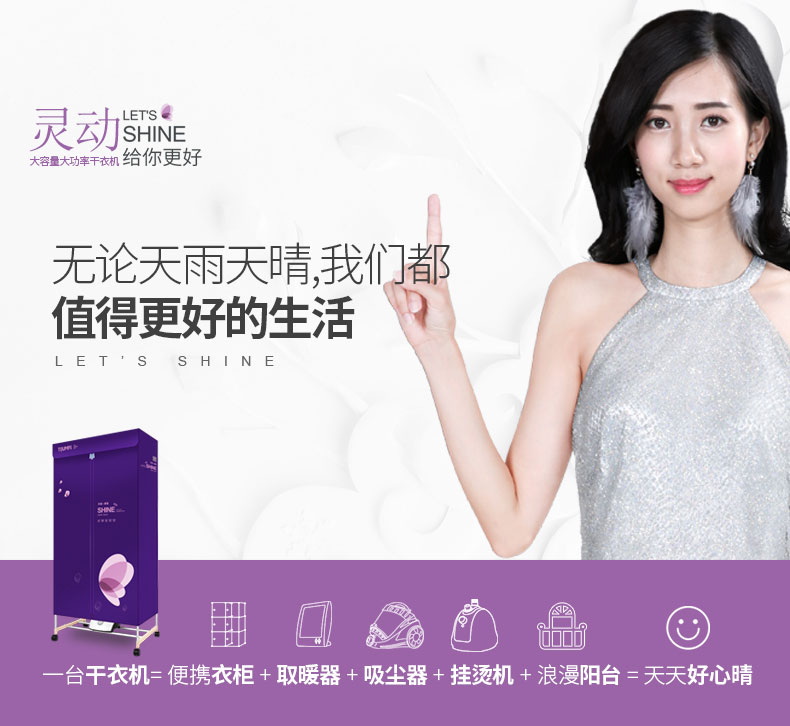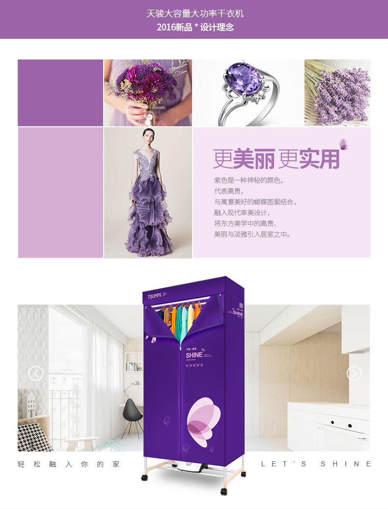 型号: TJ-218M 颜色分类: 紫色 功率: 501W(含)-1000W(含) 形状: 立方形 承载重量: 10kg-15kg 最大定时范围: 121分钟(含)-240分钟(含) 有无脚轮: 有 是否有断电保护功能: 有 加热方式: PTC 适用场景: 家用 支架材质: 铝合金 控制方式: 机械式