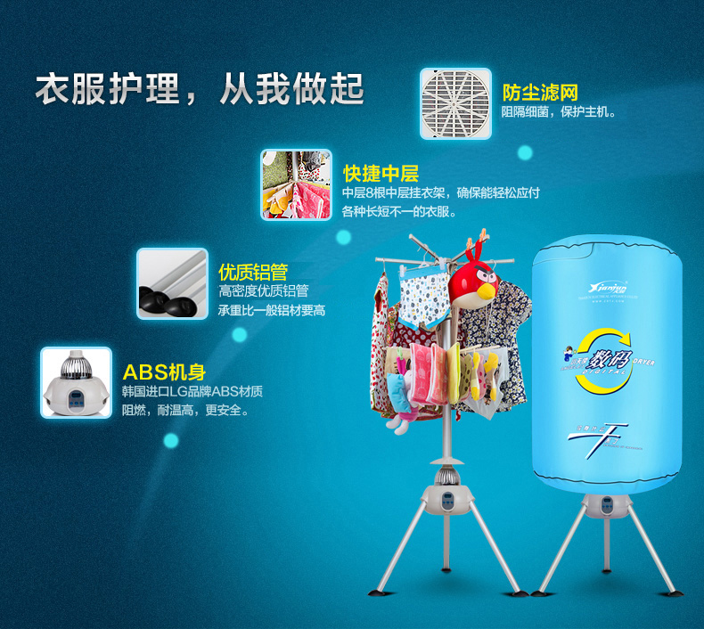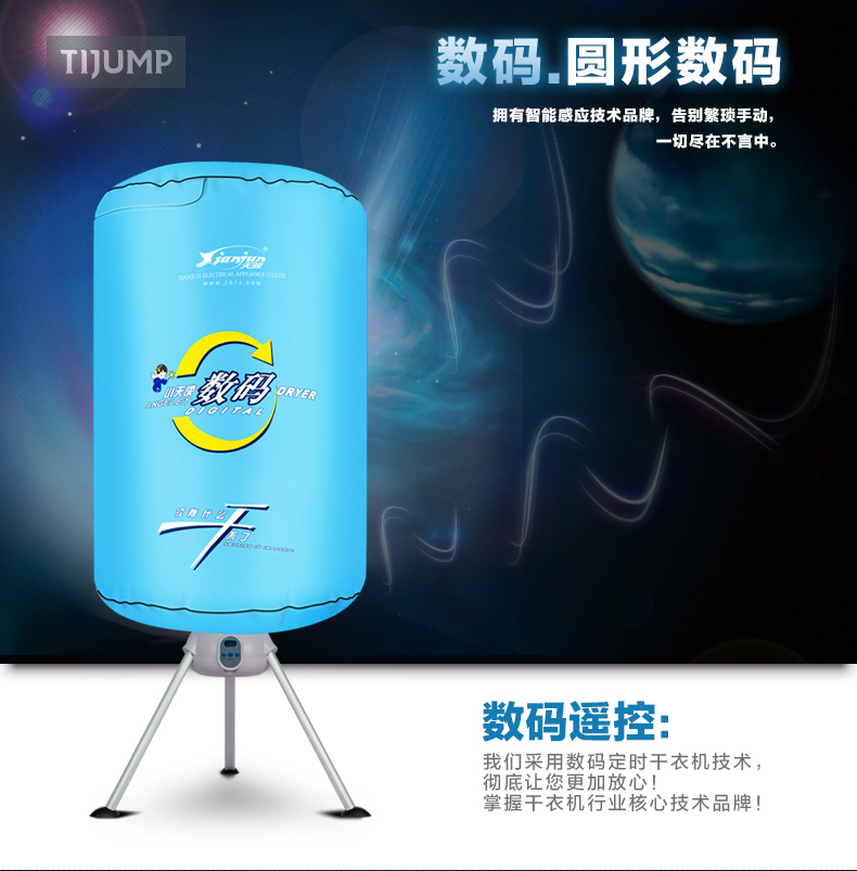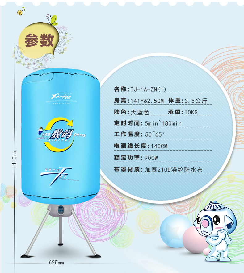 型号: TJ-1A-ZN(I) 颜色分类: 天空蓝 功率: 501W(含)-1000W(含) 形状: 圆柱形 承载重量: 5kg(含)-10kg(不含) 最大定时范围: 241分钟(含)-480分钟(含) 有无脚轮: 无 是否有断电保护功能: 有 加热方式: PTC 适用场景: 家用 支架材质: 铝合金 控制方式: 电脑式